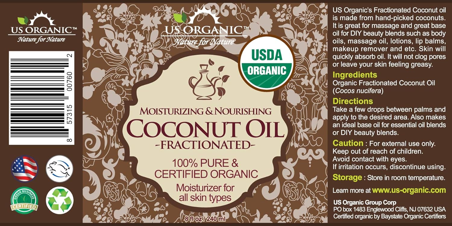 US Organic Fractionated Coconut MCT Oil (Liquid Coconut Oil), USDA Certified Organic, Non-GMO, Perfect for massage, carrier oil for DIY blends, Hair, Skin care. 100% Pure, Hexane-Free (8 oz)