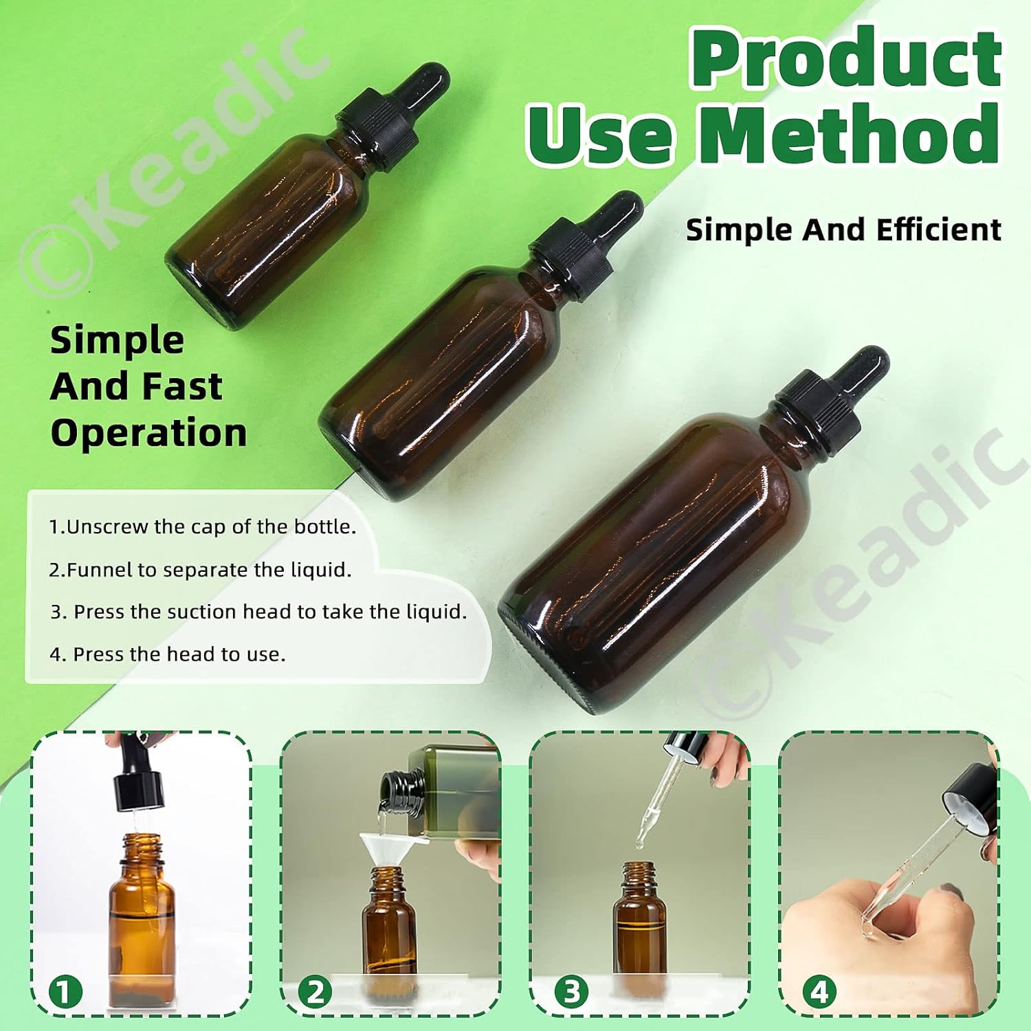 - 【Easy to Dispense and Drop】Amber glass eye dropper bottle helps you dispense the oil and other liquid without spillage, transfer liquid more handy. The long reusable glass droppers are long enough to drop liquid more efficiently, especially when there is a small amount of liquid at the bottom.