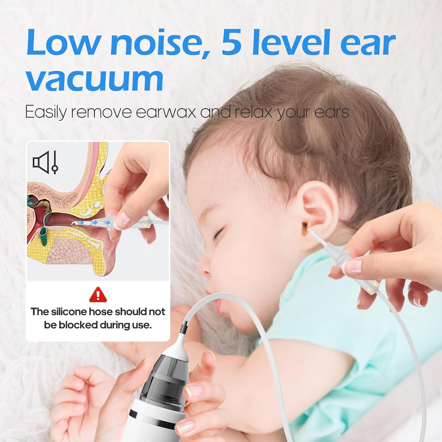 - [Safer, quieter ear vacuum] -Ear wax suction decibels between 20-30 DB. This upgraded ear vacuum is connected with silicon tubes, reducing noise. The soft silicone tube tip protects your ears from the sound of the vacuum machine of the ears. Upgrade the large storage space, more conveniently collecting the earwax and ear water