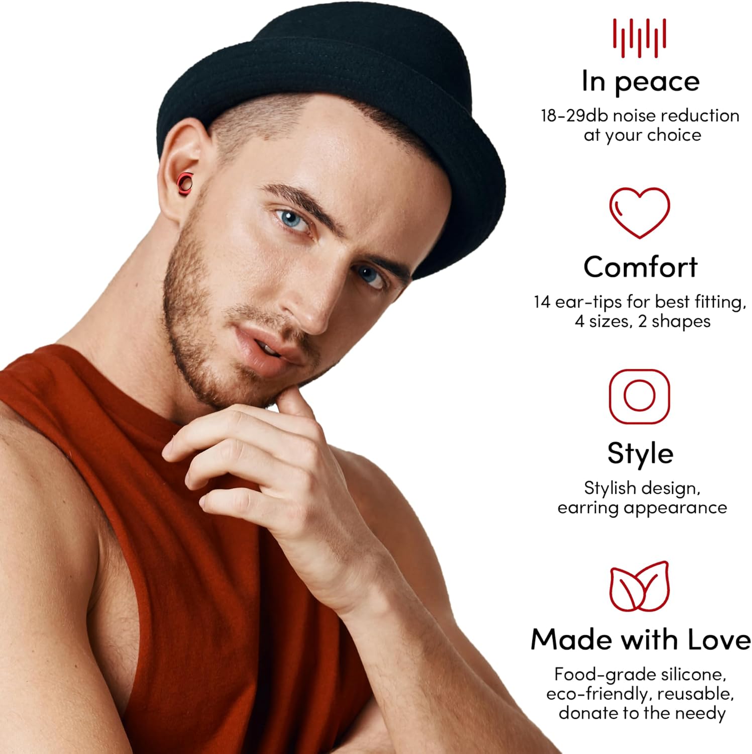 - Stylish Comfort - These earplugs come with 2 types of ear tips. The single-layer ear tips (4 sizes) provide a noise reduction rating up to 18 decibels; the double-layer ones (3 sizes) provide noise reduction rating up to 29 decibels - So that you can always find the perfect fit. The unique square shape can be angled to fit tightly and avoid falling off. It look like a fashionable accessory while protecting your hearing.