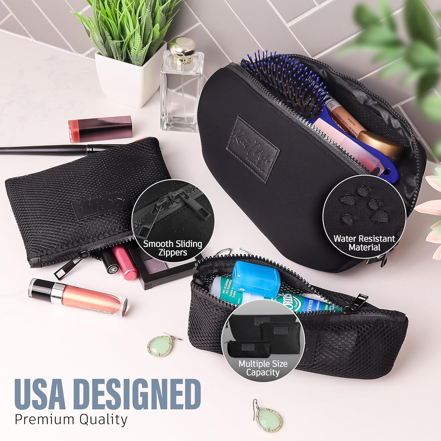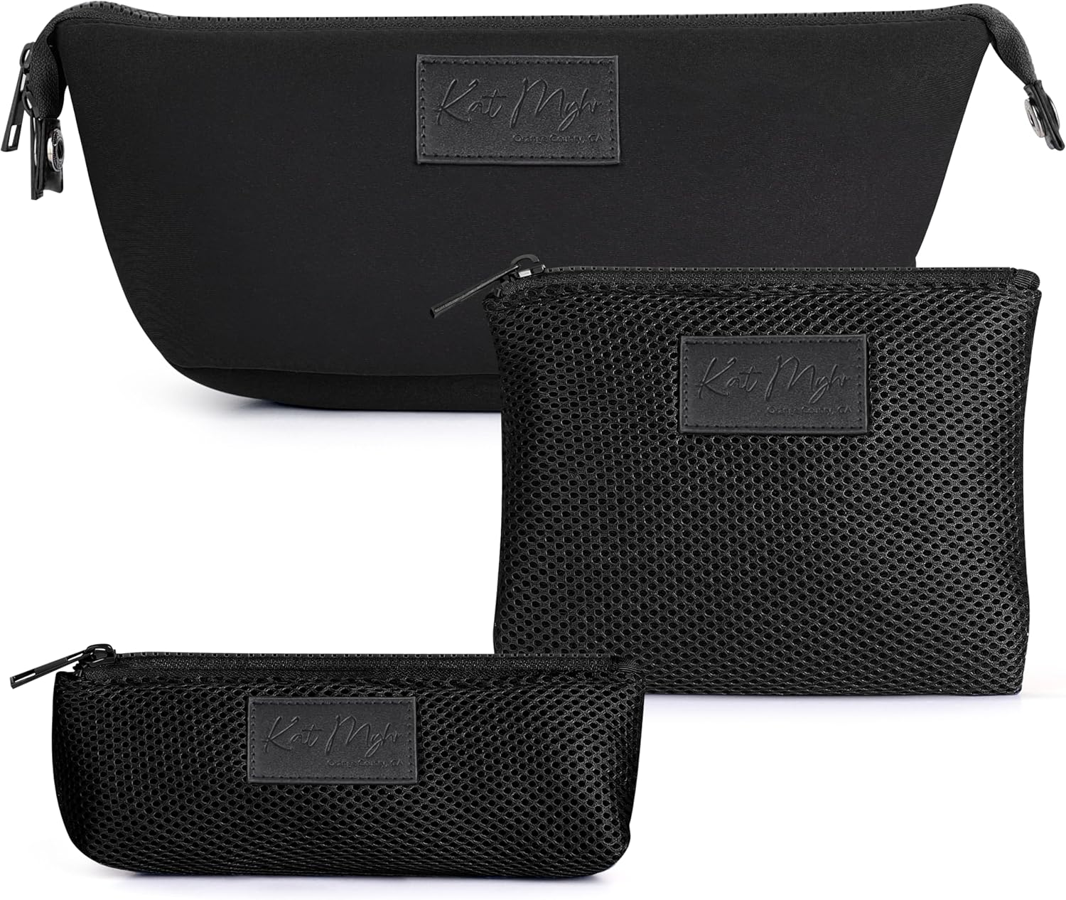 Kat Myhr Neoprene Washable Travel Makeup & Cosmetic Bag Set, 2 Air Mesh Pouches,100% Neoprene Toiletry Bag, Large Water Resistant Travel Bag for Toiletries, Makeup Cosmetic Travel Bag (Jet Black)
