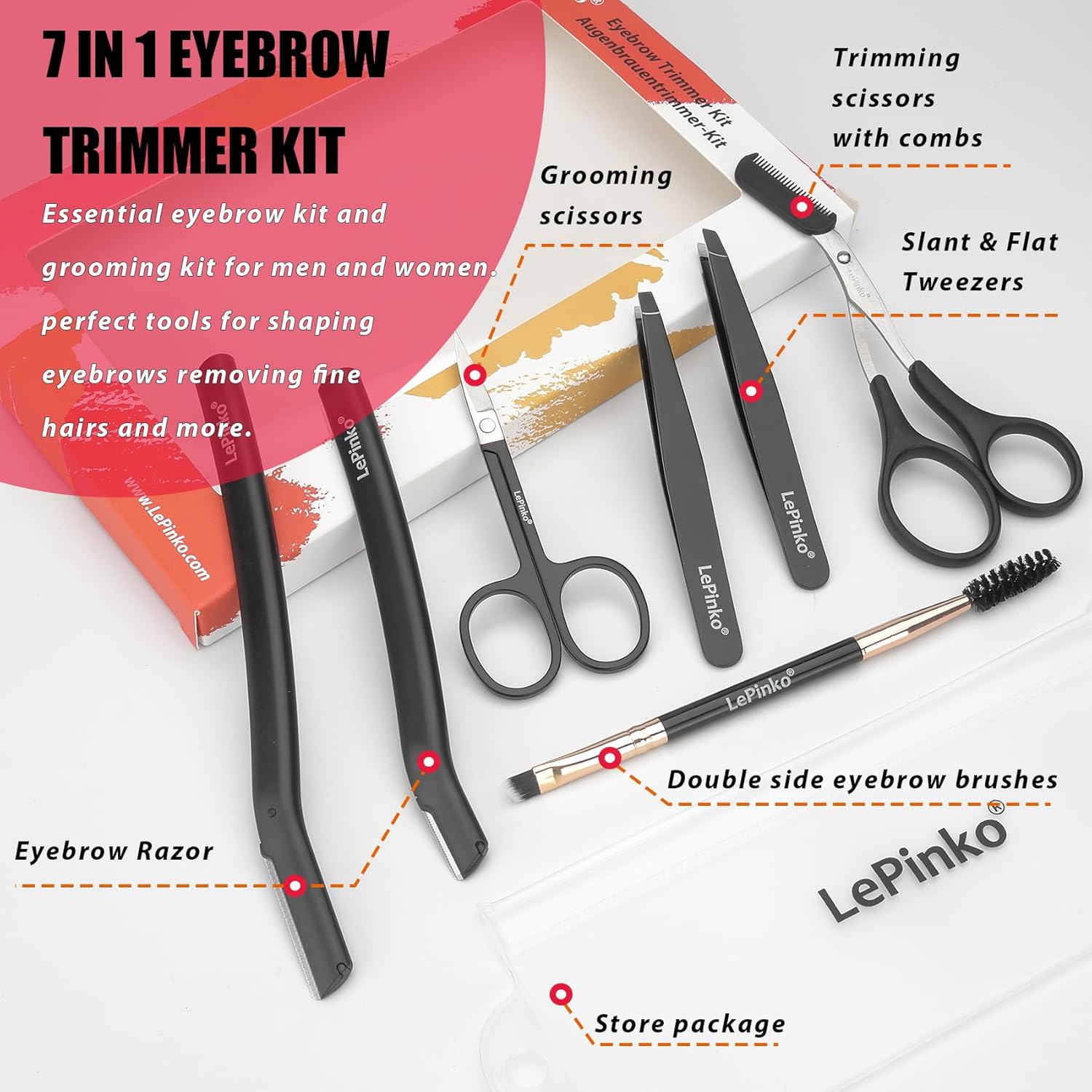 - Brow Shaping Kit - Come with 1 pair of eyebrow scissors with combs, 2 pairs of eyebrow tweezers (flat tweezers, slant tweezers), 2 eyebrow razors, 1 double-sided eyebrow brush, and 1 pair of facial grooming scissors. The must-have eyebrow kit and eyebrow grooming kit for men and women, great for shaping eyebrows, removing fine hairs and more.