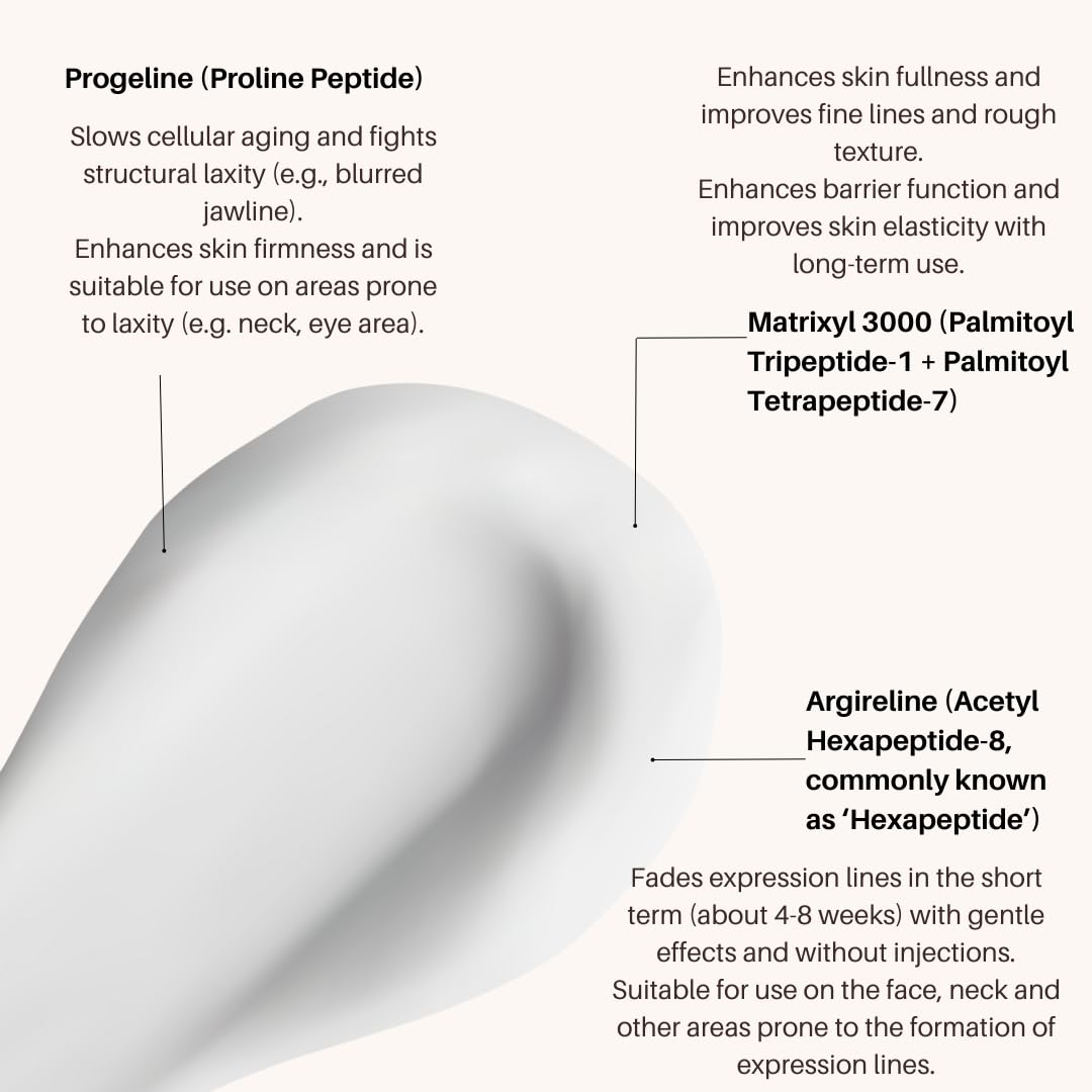 - Natural Peptide Complex to Dramatically Tighten Pores and Frown Lines Palmitoyl Tripeptide-1 + Palmitoyl Tetrapeptide-7 and Acetyl Hexapeptide-8 in the cream are popular anti-wrinkle peptides that boost collagen synthesis for fuller, smoother skin. Continued use reduces the depth of frown lines, wrinkles and crow's feet, while tightening pores to reveal a smoother, younger-looking texture for daily anti-ageing care.