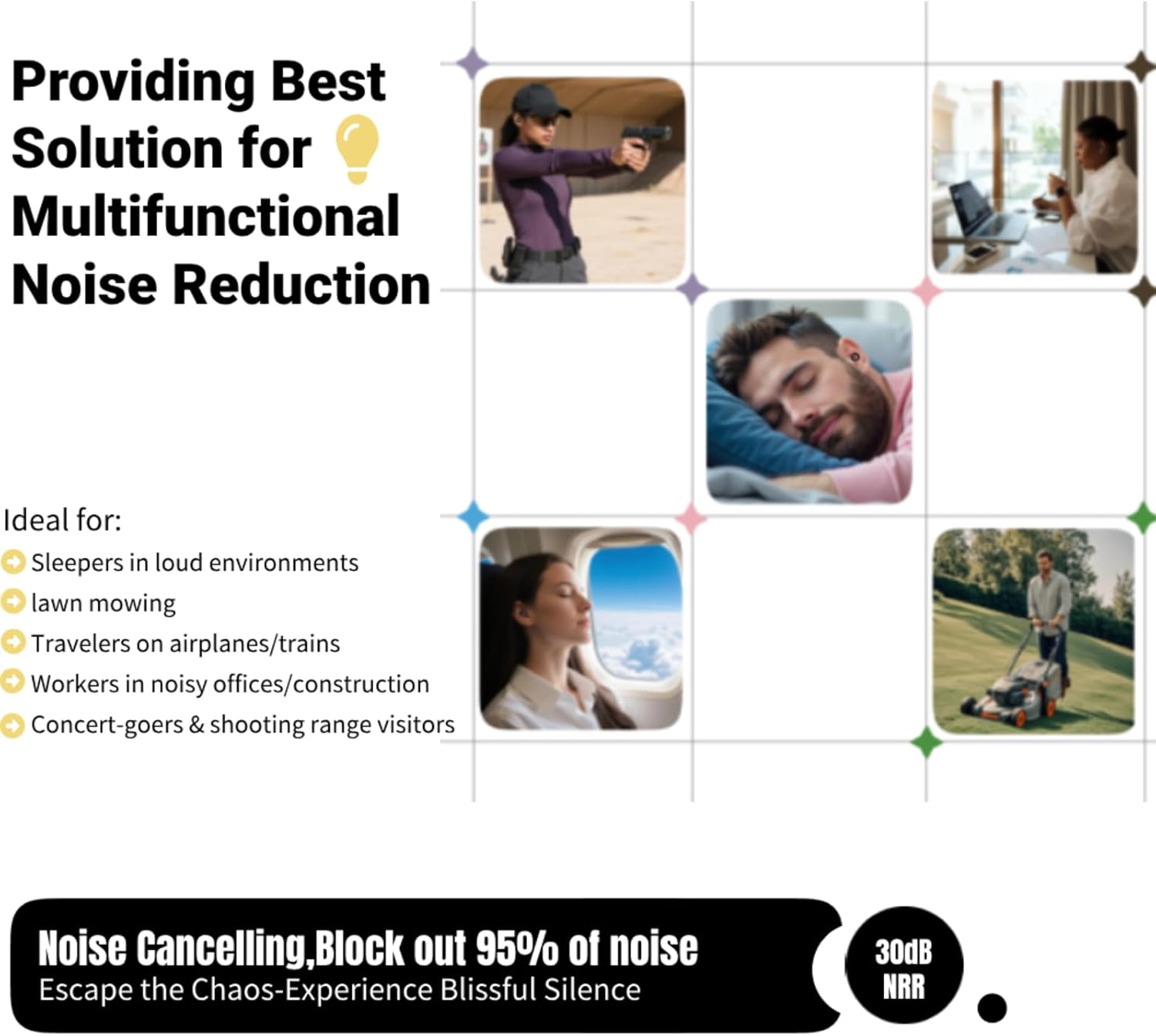 - Noise Cancelling Earplugs: Ultimate Sound Protection‌-Our advanced noise-cancelling technology effectively reduces a wide ‌range‌ of sounds, from loud concerts to airplane pressure and lawn mowing. Whether you're at work, traveling, or attending a shooting range, these ‌ear protectors‌ offer superior ‌sound blocking‌ capabilities, ensuring your ears stay protected and undisturbed.