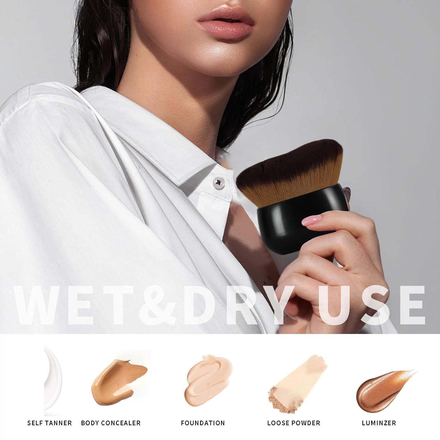 - 【Multi-Tasker for All Beauty Needs】Versatile beyond foundation and self-tanner, this brush excels with bronzer, body shimmer, sunscreen, lotion, mousse, and more. Whether you’re sculpting legs, highlighting décolletage, or perfecting back tanning, it’s your all-in-one tool for achieving a glowing, uniform look from head to toe