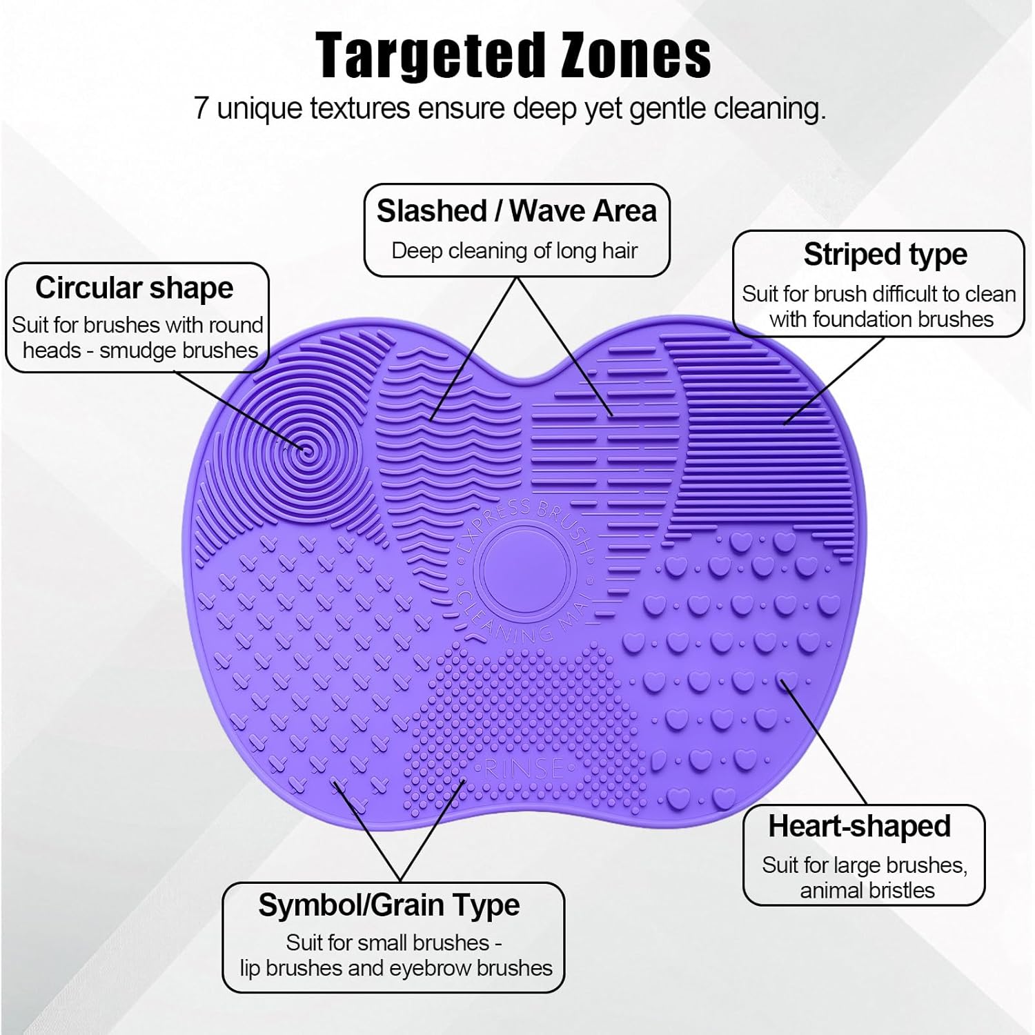 - 7 Textures for Targeted Cleaning: Features 7 unique cleaning zones tailored for different brush types—round texture for blending brushes, striped texture for foundation brushes, symbol texture for eyebrow and lip brushes, and heart-shaped texture for large brushes. Achieve deep cleaning without damaging delicate bristles